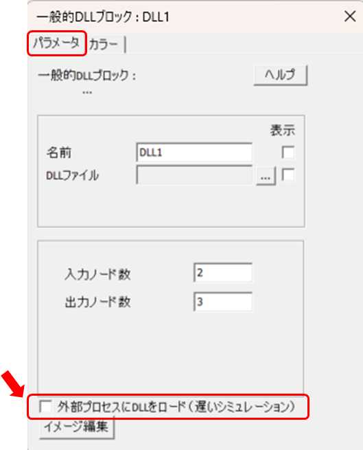 「一般的DLLブロック」のパラメータタブにある “外部プロセスにDLLをロード( 遅いシミュレーション)”