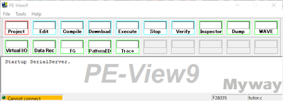起動際にPE-View9が通信できません ([Disconnect] もしくは [Cannot Connect] のステータス) 2024年11月07日 04:56 更新 インストールされたPE-View9 メイン画面下部のステータス・バーは、下記図のように表示されます。[Disconnect] もしくは [Cannot Connect] のステータスです。画面右下にはコンパイル対象のターゲットタイプとソースファイルが表示されます。インストール直後には「tutor.c」が選択されています。 もしくは 回答 下記のフローチャートをご覧ください。 関連記事 PE-View9通信ポート設定について PE-View9を起動するとg_GetProjectCfg(15) is Failとエラーが発生する [Compile] エラーメッセージ「You do not have a license for PEOS. Check the USB Key」 PE-View9起動時に「can not read PROJECT file... Please re-select PROJECT file or confirm version of PEOS」エラーが表示される 交流出力の最大電流を教えて下さい