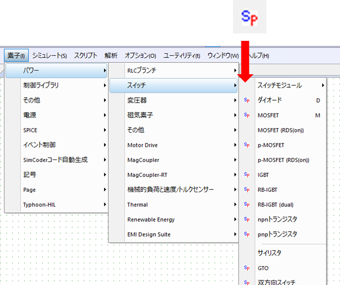 チェックを入れていただいた後にメニューバーの「素子」から見ていただくとSPICEに対応した素子は、 素子の左側にのマークがつきますのでそこでご確認いただけるようになります。