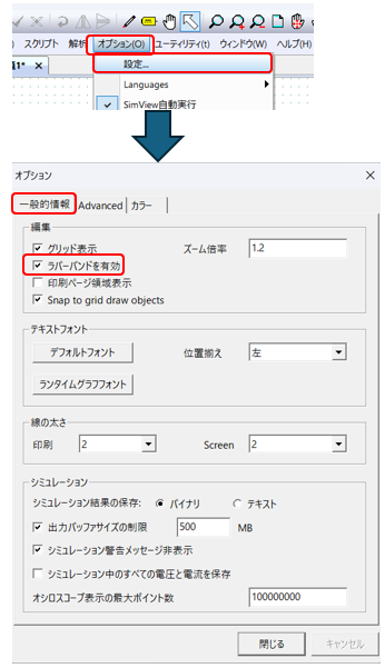 また、PSIMメニューバーの “オプション>>設定” のタブ “一般的情報” の ”編集” 部分に “ラバーバンドを有効 ” という項目があります。そこのチェックボックスにチェックをいれていただくとShiftキーを押さずに結線したまま移動させることができるようになります。