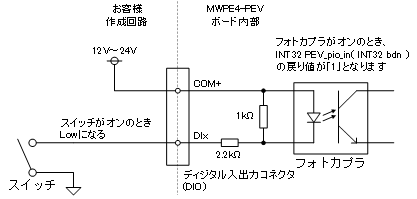 この接続でスイッチがオンのとき、DIxがLowとなり、フォトカプラがオン、INT32 PEV_pio_in( INT32 bdn )の戻り値が「1」となります。