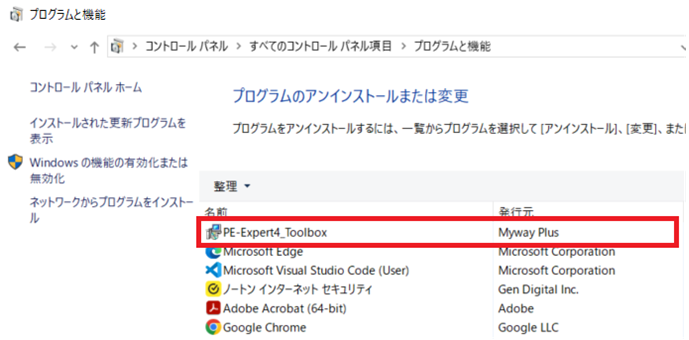 [コントロールパネル] -> [プログラムと機能] -> [PE-Expert4_Toolbox]を選択-> 右クリック -> “アンインストール”を実行