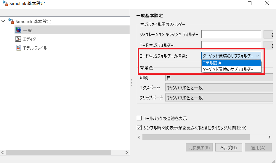 - [モデル化] タブ → [環境] セクション → [Simulink基本設定] をクリック
